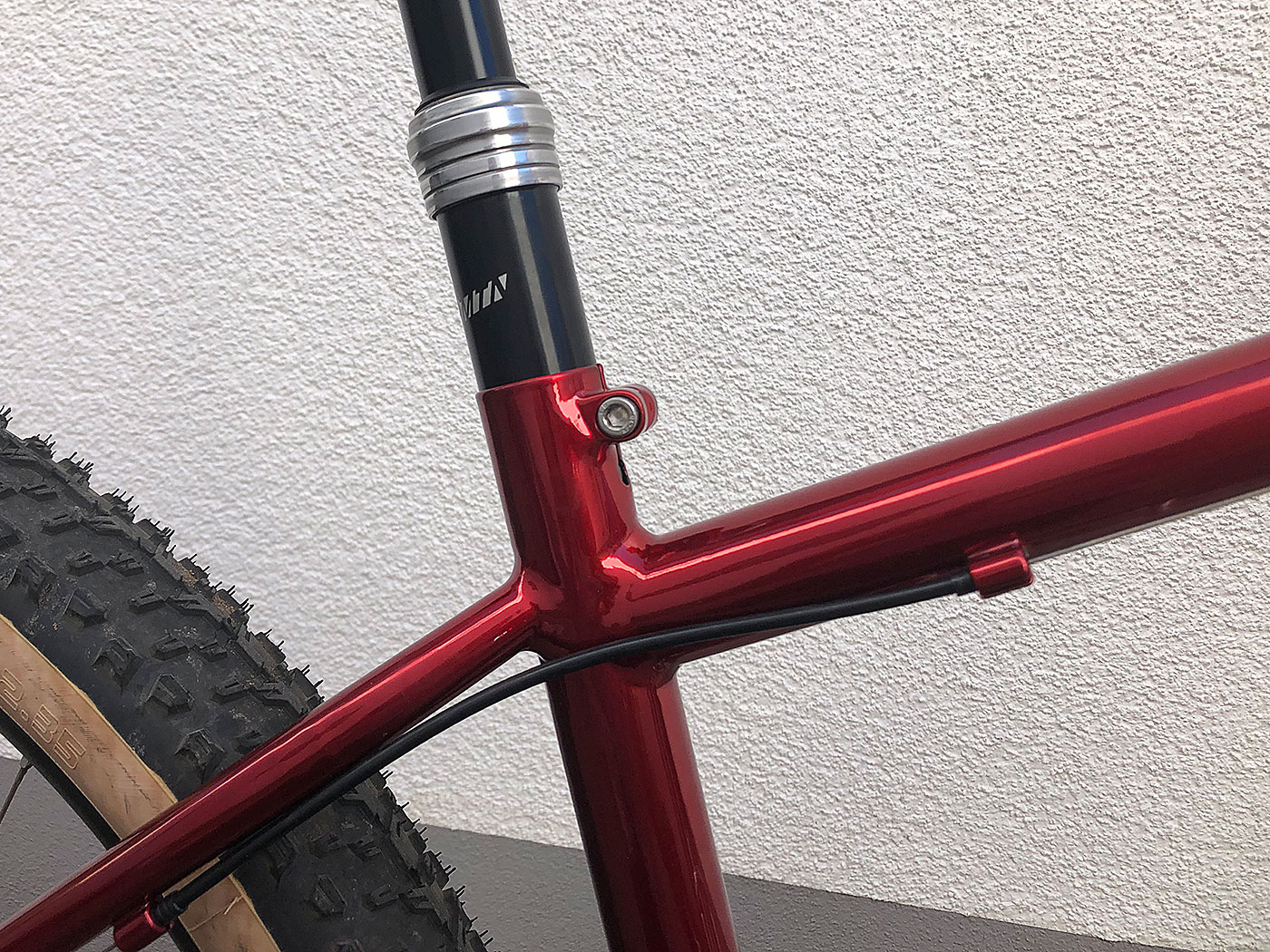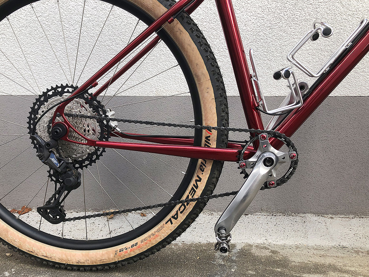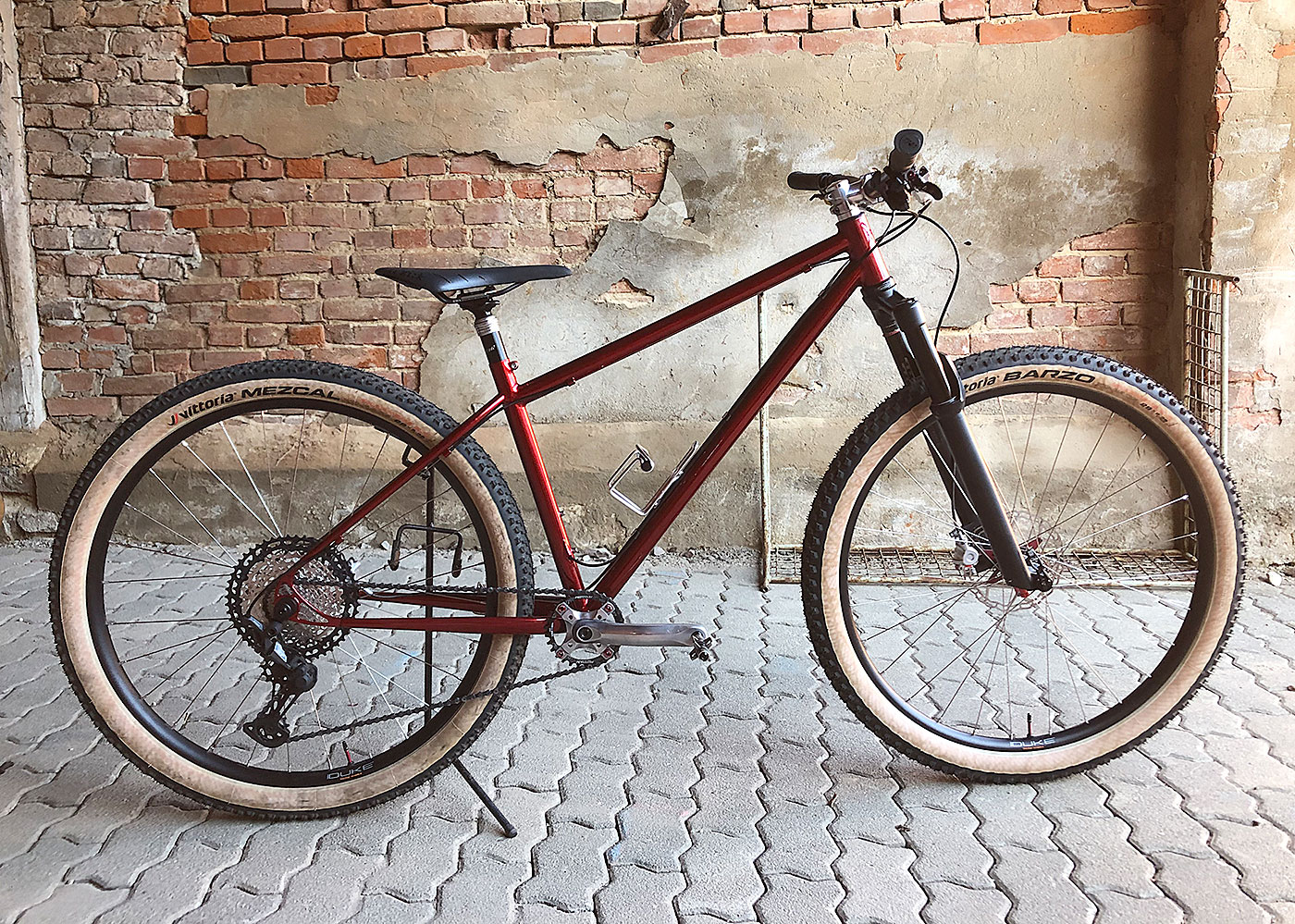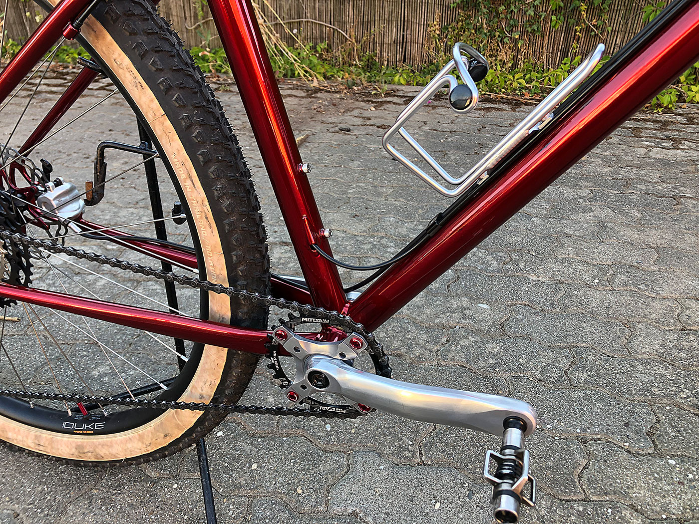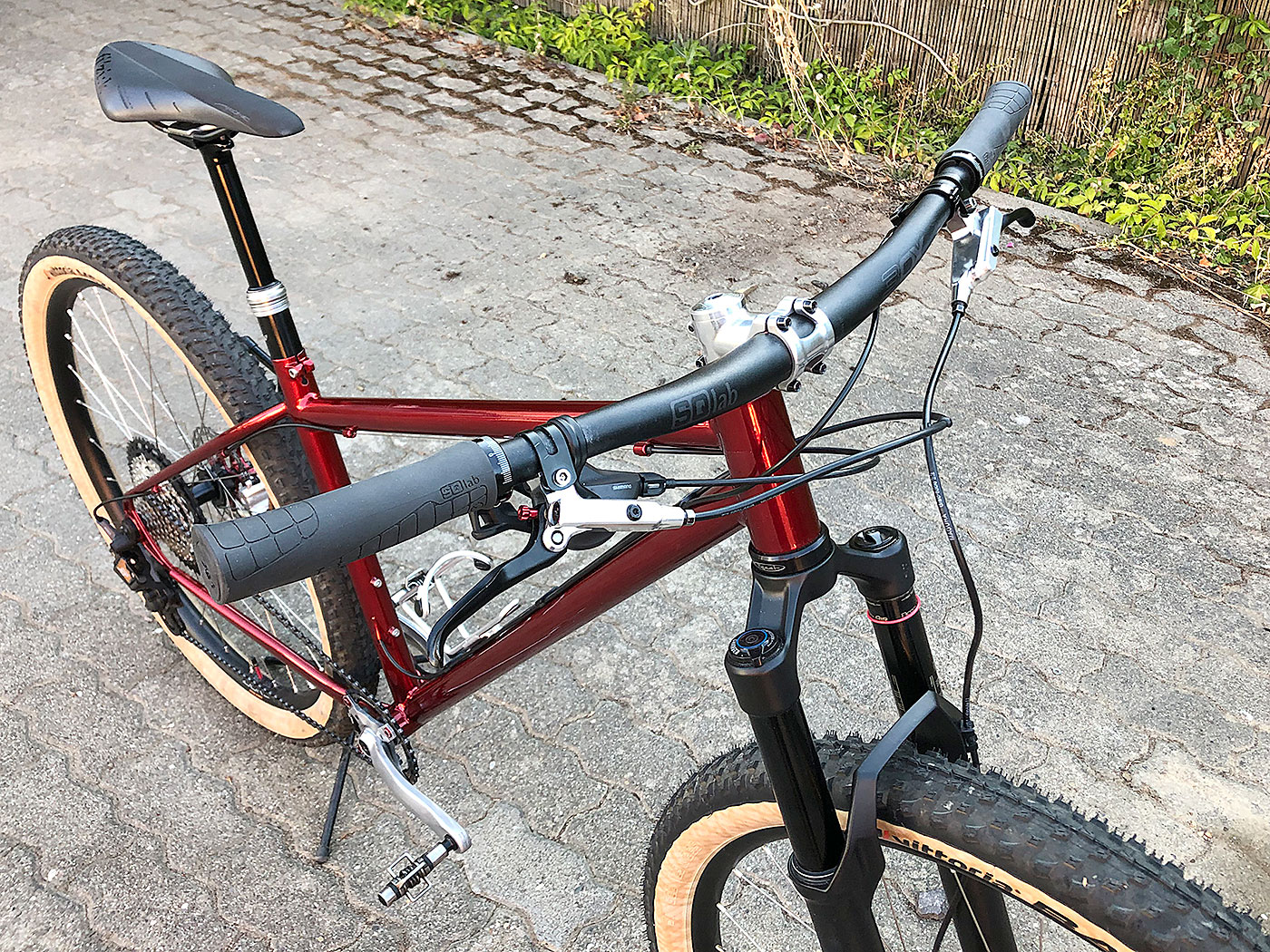 Der im Kurs gefertigte Rahmen wurde mit einer Kunststoffbeschichtung in candyrot konserviert und mit erlesenen Bauteilen in ein reinrassiges MTB verwandelt.